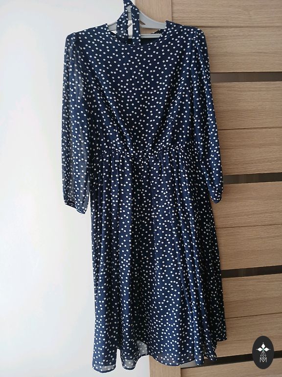 Melna ar baltiem krikumiņiem kleita ar 3/4 piedurknēm un kabatām. Izmēri: krūtīs 120 cm, gurnos 126 cm, kleitas garums pa muguras līniju 100 cm. Atrodas Rīgā, Purvciemā. Sūtīšanu apmaksā pircējs.