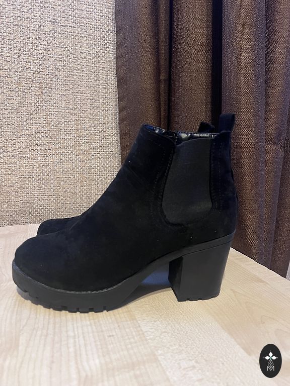 Elegants seemisnahast poolsaapad. Dekoratiivsed rihmad on valmistatud matist nahast, pannal hõbedane-must. Vooder on pehmest, õhukesest nahast. Kontsa kõrgus 9 cm, laius 5 cm. Kanna kõrgus 10 cm, tõmbluku pikkus 13 cm, tõmbluku jooksur logoga. Hüppeliigese ümbermõõt 27 cm. Kontsas on paigaldatud amortisaator ANTIshokk.