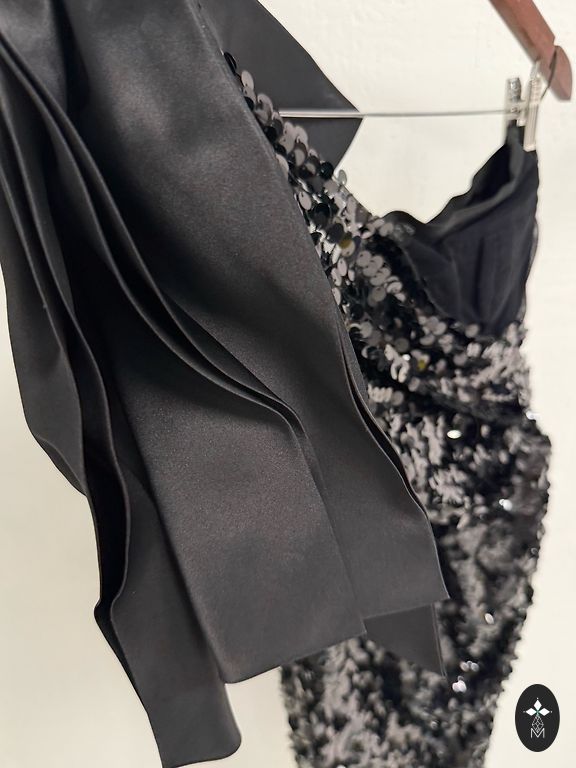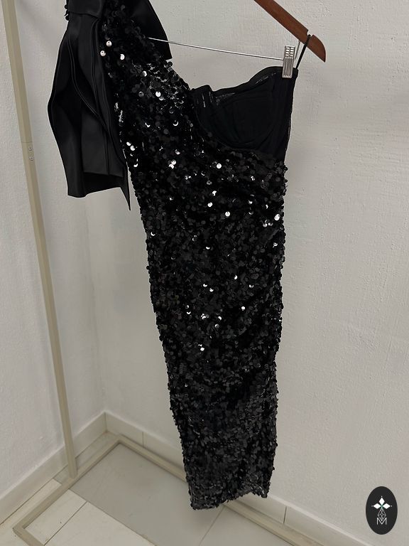 S-suuruses kleit, sobib ideaalselt pikkadele naistele. Ees veidi lühem (105 cm) kui taga (120 cm). Varruka pikkus 45 cm. On taskud. Kaasas vöö. Kaunid pärlielemendid.