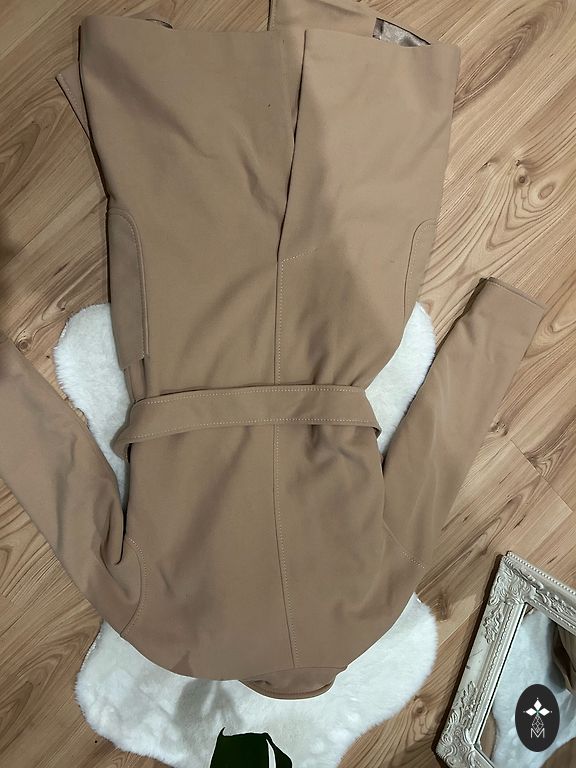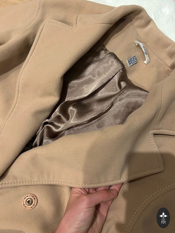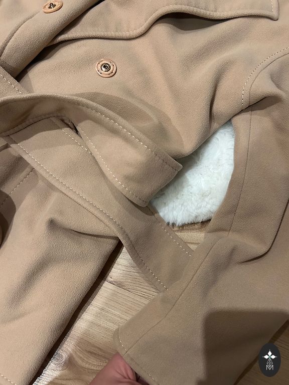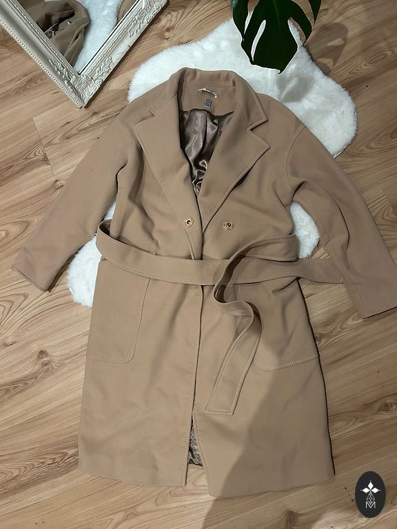 Mid-season coat, not very warm, but not lightweight, beige color with golden buttons and a belt. M/L, length 103, sleeves 64, from armpit to armpit 51.
