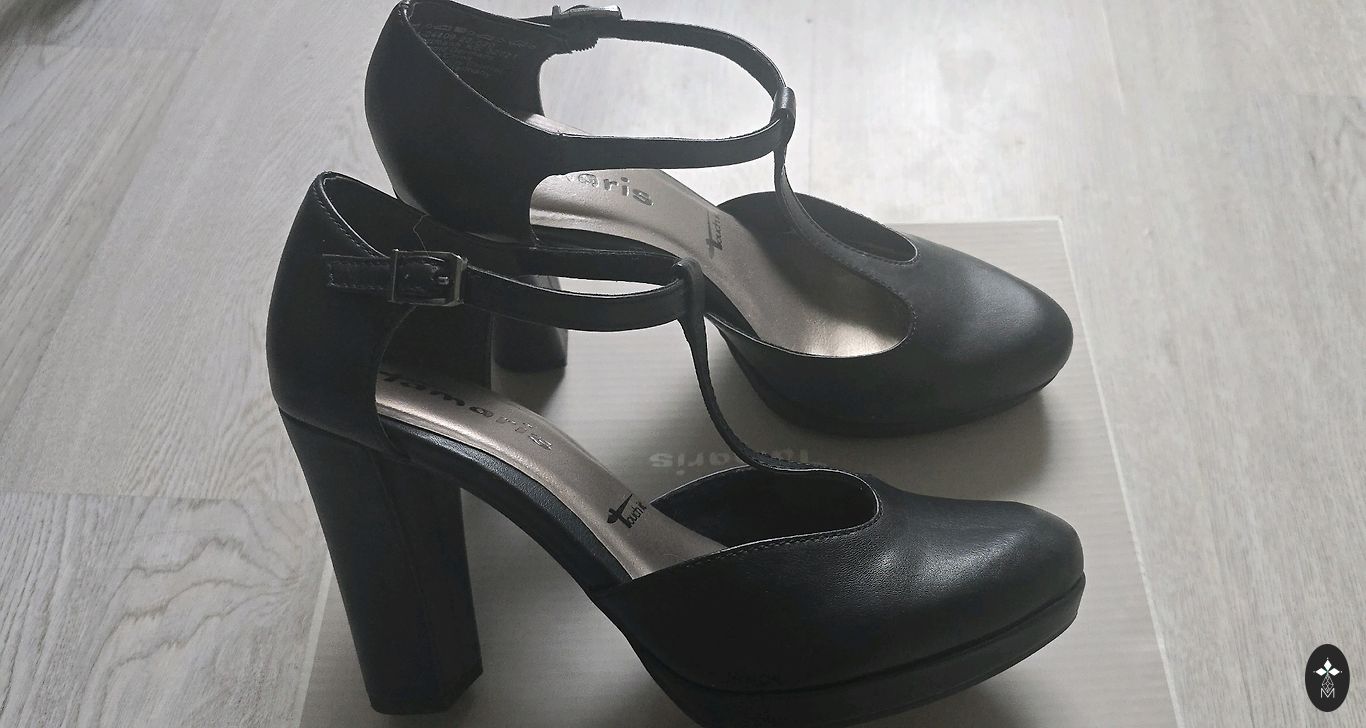 Uz viena papēža ir neliels bojājums / skrāpējums apakšējā daļā (redzams fotogrāfijās). Defekts ir kosmētisks.