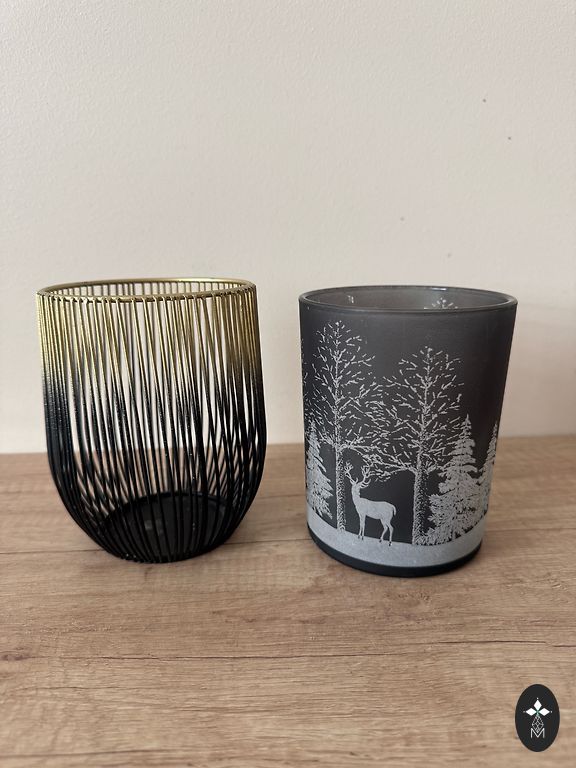 Wooden candle holders - houses with copper chimney.