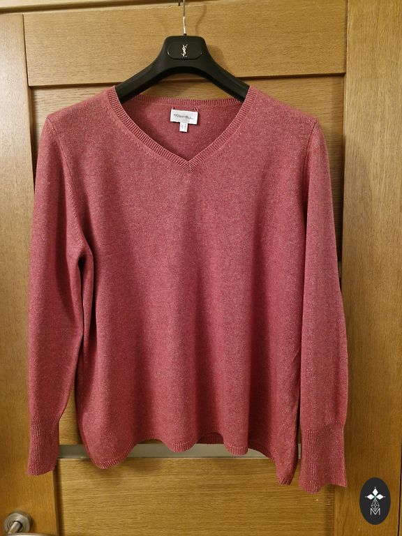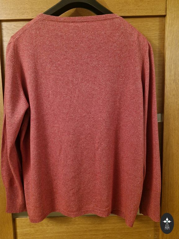Ryškios vyno raudonos spalvos šventinis megztinis su blizgesiu. Dydis 3XL, krūtinė 140cm, klubai 170cm, rankovės nuo apykaklės 73cm, ilgis 63/76cm nugara gražiai pailginta. Medžiaga - aksomas ir blizgučiai, gerai prisitaiko. Gražus!