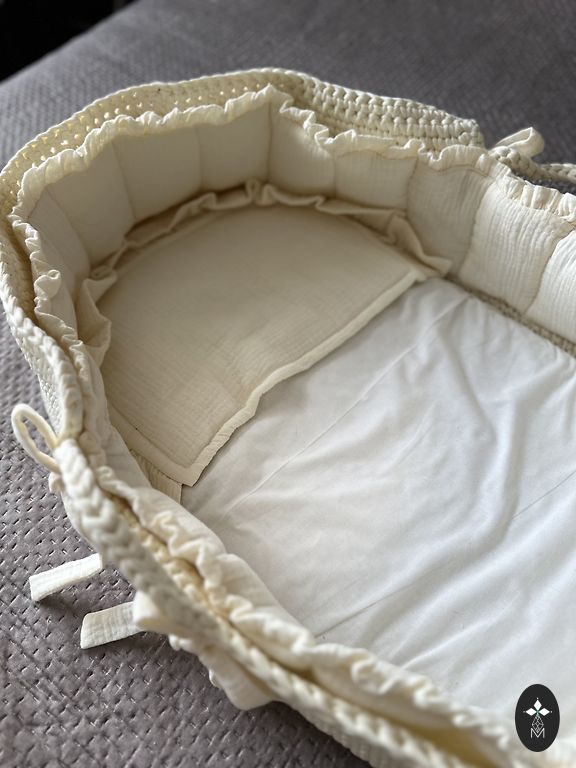 Гнездышко можно стирать в стиральной машине в щадящем режиме при 40 градусах. Перед этим необходимо вынуть основание, плотно завязав натяжную ленту, чтобы она не вытащилась во время стирки.