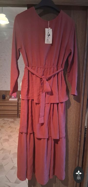 Graži ilga suknelė ugningai, aukštai damai. Puikiai priglunda ir fantastiškai atrodo. Bet man, su mano 164 cm, tikrai vilkasi žeme. Petnešos reguliuojamos kaip liemenėlės. Priekyje - tarp tų volanų, yra 2 skeltukai, kurie bus virš kelio.