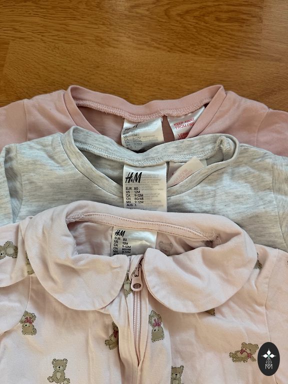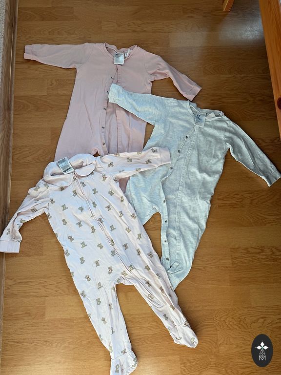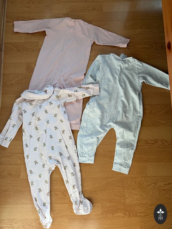 100% puuvillast pidžaamad suuruses 68-80. (98-99% orgaaniline puuvill). Tütre sünnipäev oli veebruaris, seega need pidžaamad olid talle esimesel eluaasta suvel - need on väga heas seisukorras, neid oli palju ja seetõttu ei kulunud need ära.