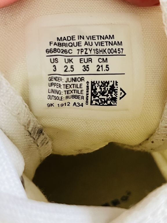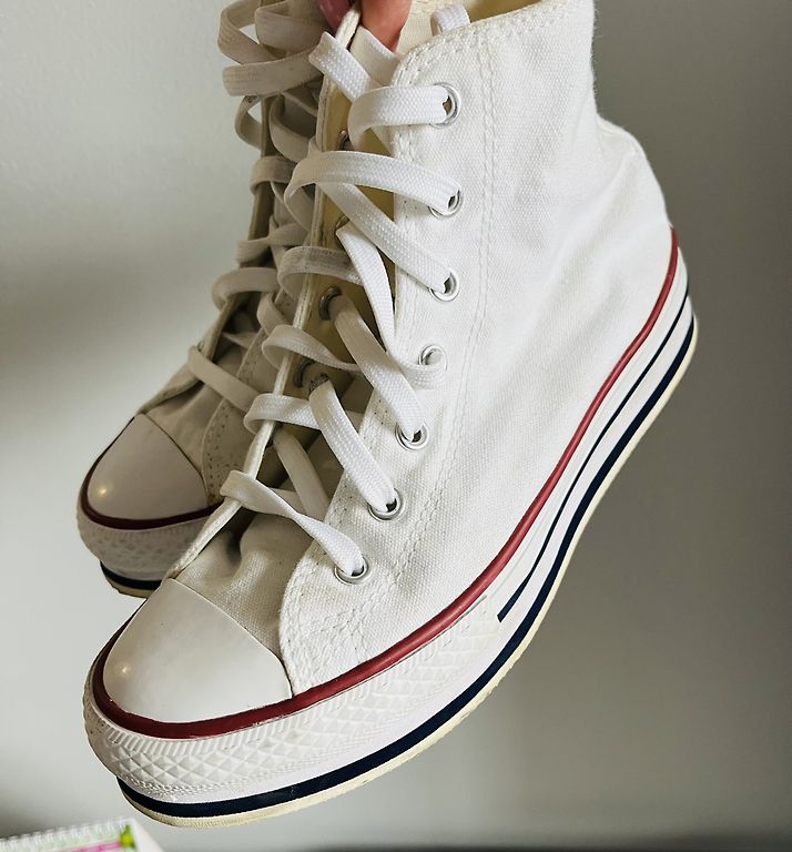 Not much worn, quickly became too small. The tips and the white line, as rubber, have darkened.