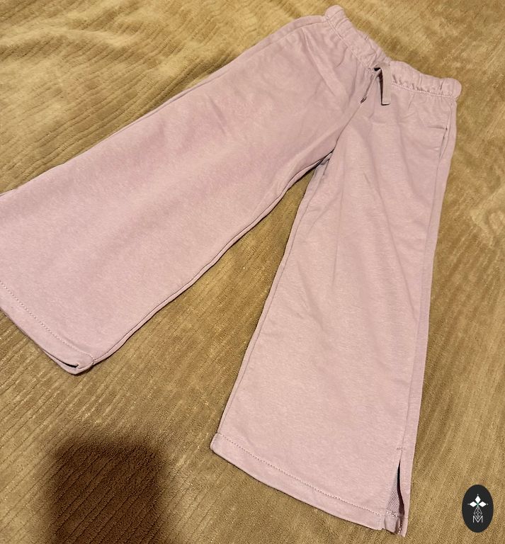 Bikses ar paplatinātiem galiem no Lindex (gaišās) un Next (tumšās). Jaunas, bet bez birkām. Tikai piemērītas, lai saprastu, ka neder platumā, jo meita ir ļoti smalka. lindex biksēm iestrādātas gumijas viduklī, ko var savilkt. Labāk derēs vidēja auguma meitenēm, ne smalkām. Garums no stakles lindex 43.5cm, next 42.5cm. Garums no vidukļa abām 60cm