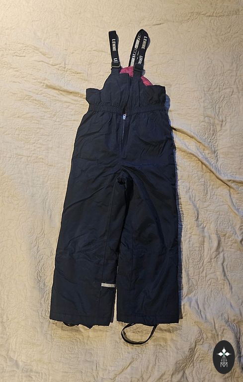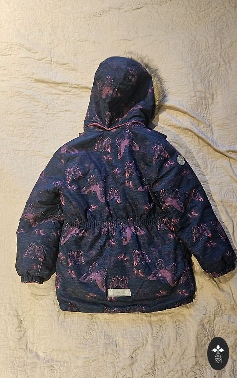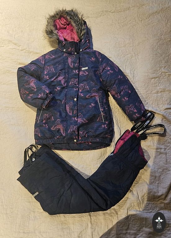 Ir trūkumi - nogrieztas gumijas pie kājām. Ir lietojuma pazīmes, bet citādi labā stāvoklī, bez defektiem. Viegls, ērts un silts. Nav dikti pufīgs, bet bērnam ērti kustēties.