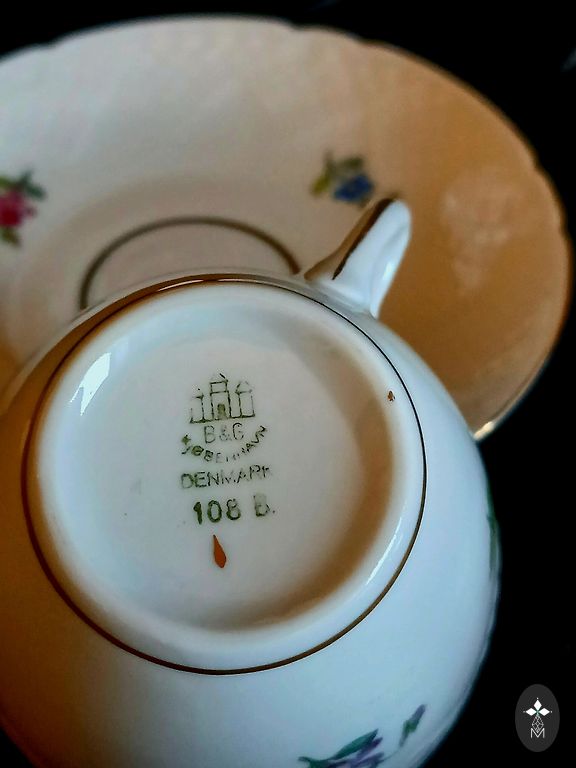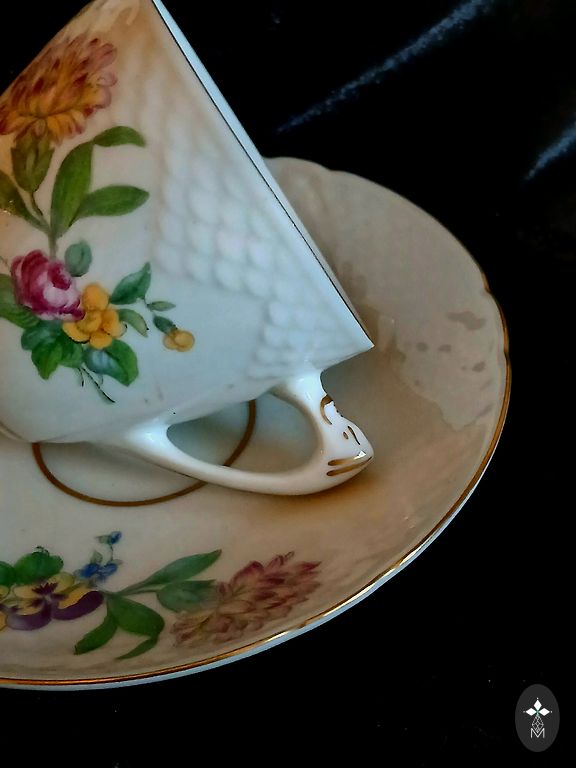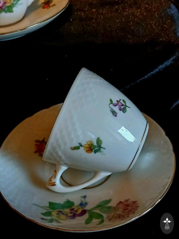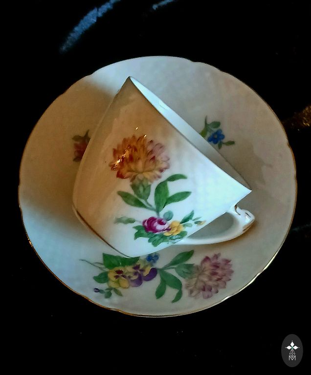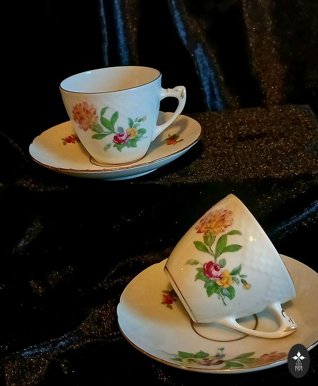 Burvīgas, vintage kafijas pāri (demitasse). Zilas krāsas tasītes kombinācijā ar baltām apakštasītēm izskatās ļoti izsmalcināti. Brīnišķīgs, ziedu, zelta ornaments rotā tasītes un apakštasītes. Priekšmeti ir dekorēti ar zelta joslu gar malām un tasītes kājiņu. Tasītes forma ir ar rievotu dizainu. Apakštasītes forma ir viļņota. Priekšmetu forma asociējas ar ziedu formām. Ļoti interesants tasītes roktura dizains ar gredzenu. Ražotājs Korosteņas porcelāna rūpnīca (KFR). Ukraina. Zīmogs tika izmantots no 1960 līdz 1999 gadam. Zīmoga sarkanā krāsa norāda, ka izstrādājums pieder augstākajai šķirai. Tasītes augstums 5,5 cm. Tilpums 100 ml. Tasītes augšējā daļa 6,5 cm. Tasītes apakšējā daļa 3,5 cm. Apakštasītes diametrs 11 cm. Kafijas pāri tradicionālai un patīkamai kafijas baudīšanai.