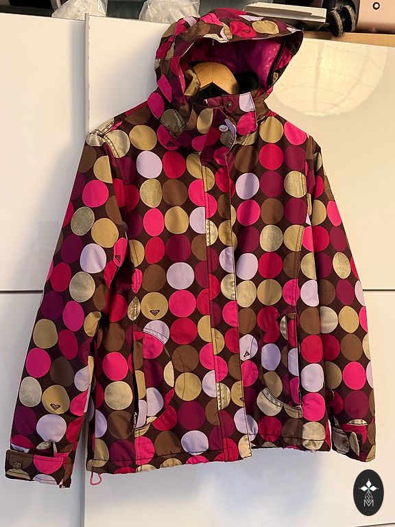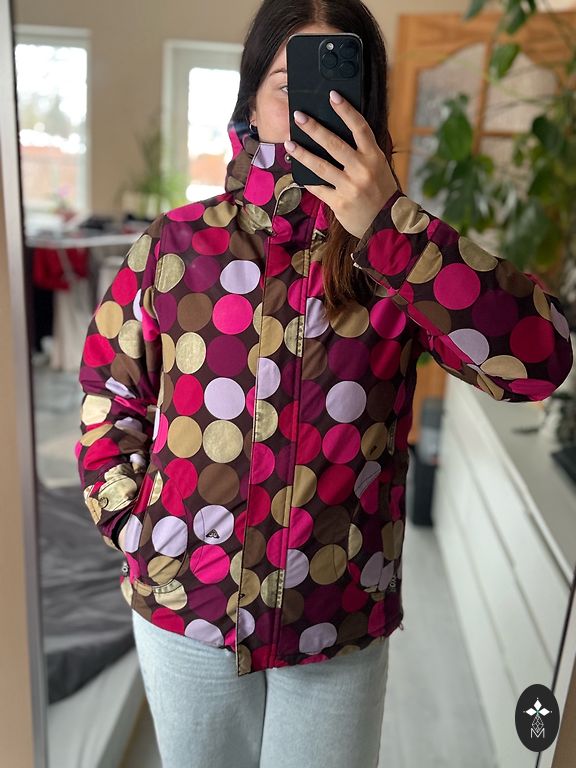 Huppas ziemas jaka. Skaistos rotaļīgos toņos. Ir iespējami trūkumi, kas šajā gadījumā ir pleķi. Jakai var noņemt gan kapuci, gan spalvu.