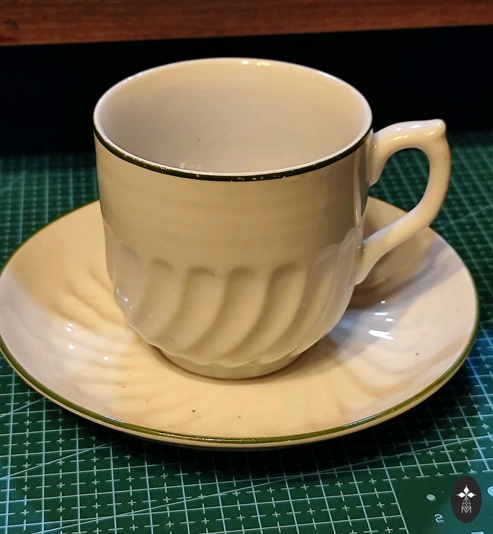Trys daiktai - kavinukas, pieno indelis, cukrinė.