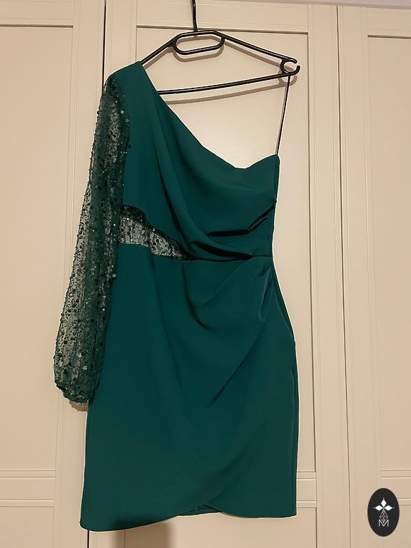 Juoda su blizgučiais suknelė, audinys tankus, su pamušalu. Krūtinės apimtis - 100, klubų apimtis - 104, liemens apimtis - 96, ilgis - 88