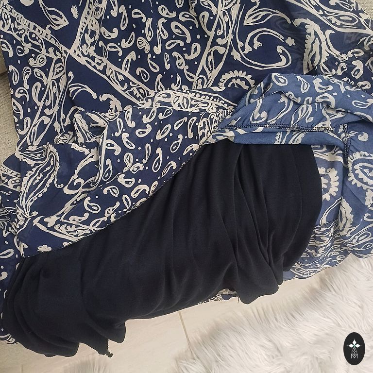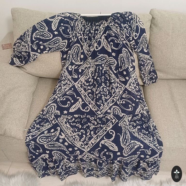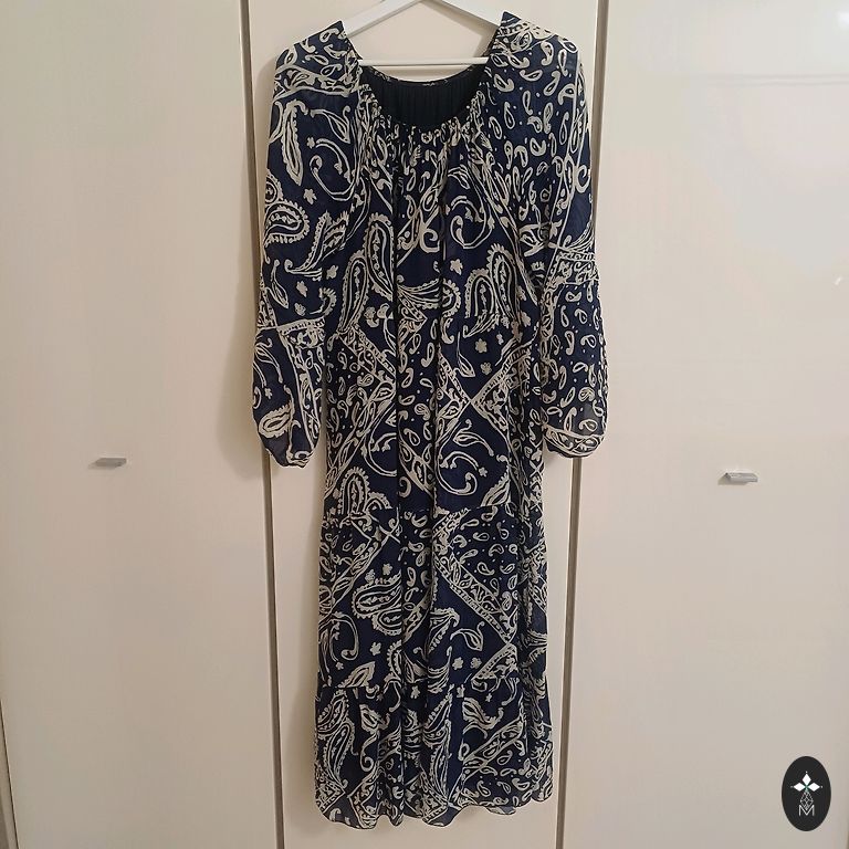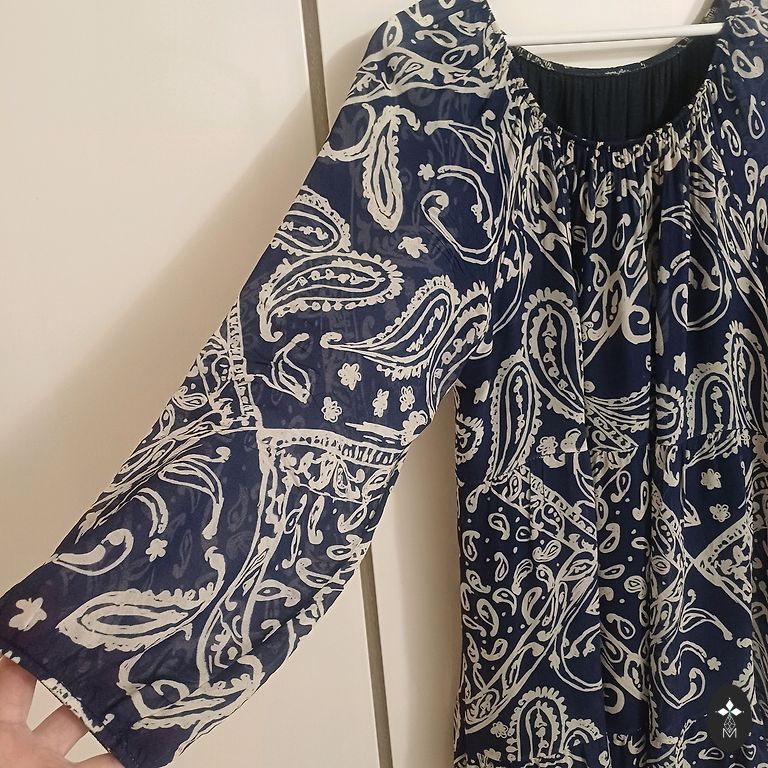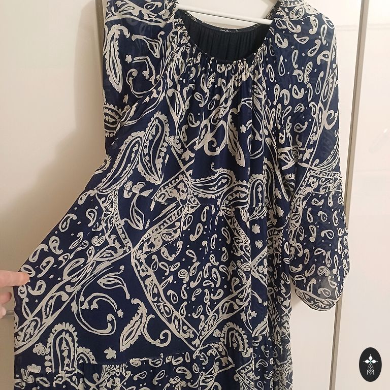 Labai graži, ryškiai juoda suknelė su pamušalu. Viršutinis sluoksnis ir rankovės permatomos. Priekinė dalis iki vidurio užsegama sagomis. Patogi, gražiai krentanti. Krūtinė 122, ilgis 123 cm. Nurodytas 48 dydis.