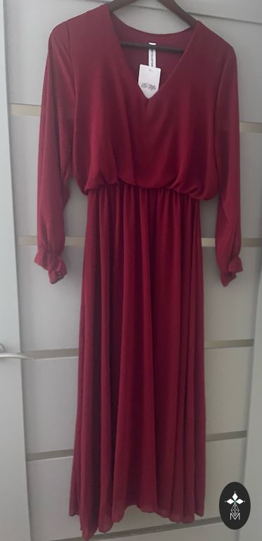 Selling a beautiful dress made in Italy, burgundy with small stones. Suitable for S/M size. Shoulders 42cm, underarms 47cmx2, sleeve length 62cm, length 100cm. Selling because it's too tight for me.