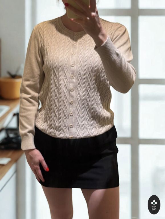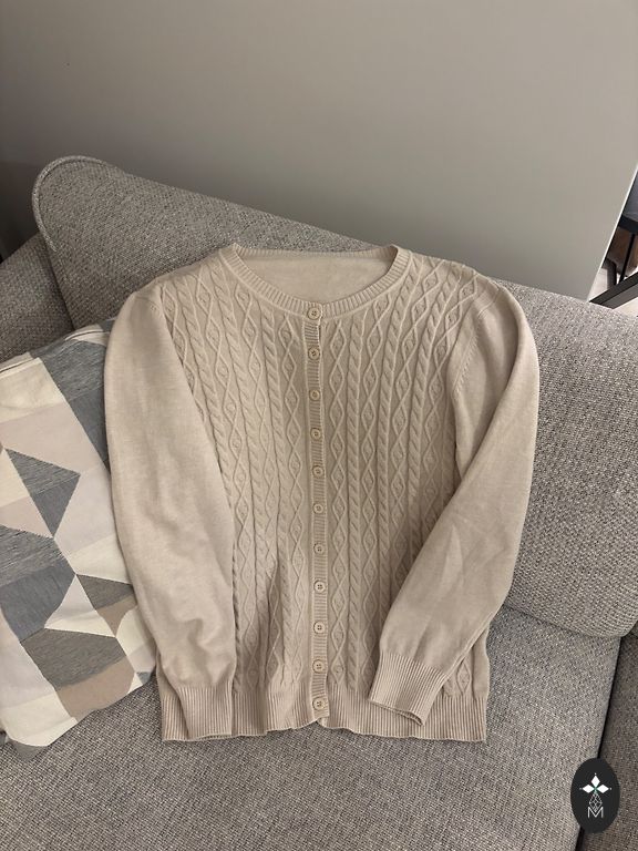 Warm, soft cardigan. Very light pink color. There is also a brown one.