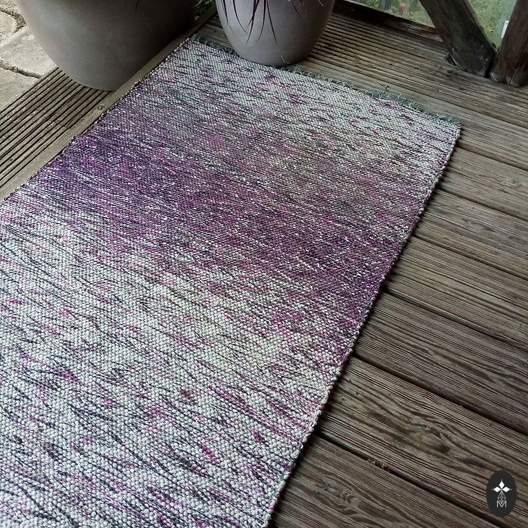 Floor runner - handmade, woven from various threads. Can also be used as a chair cover. Each end is a different color, both sides are identical and usable. Can be gently washed. Size: 1.58 m x 0.73 m.
