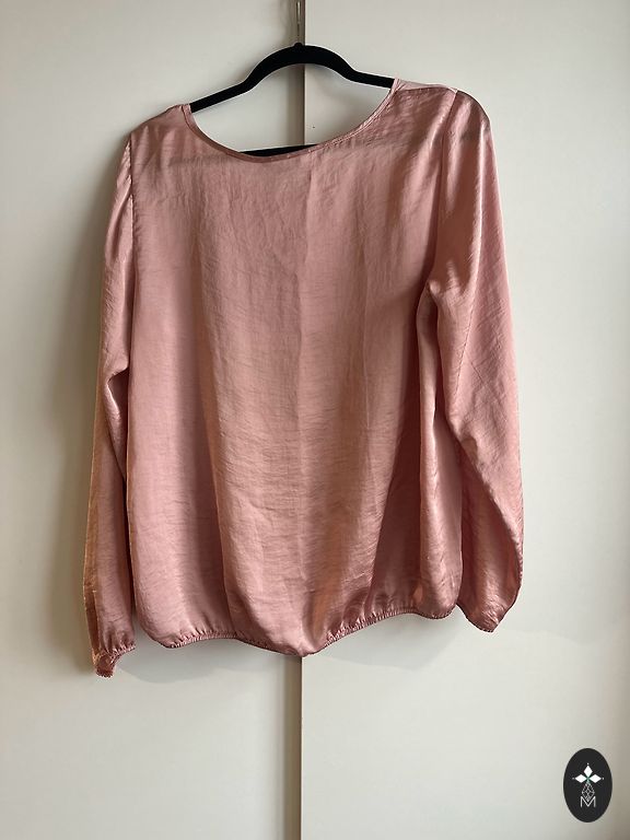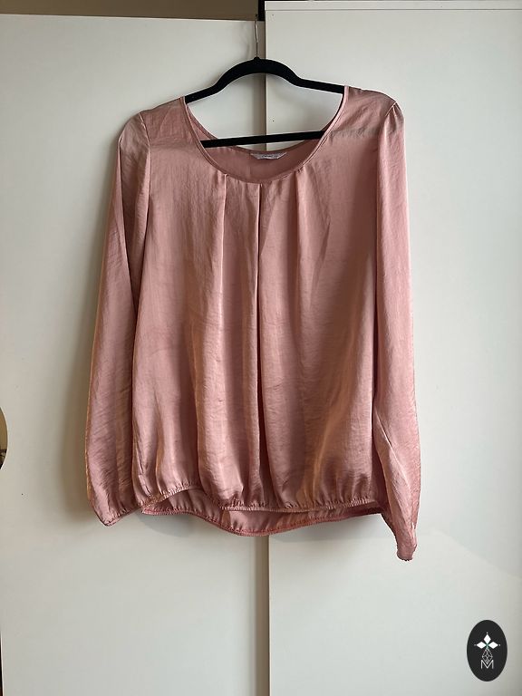 Raiba blūze, 40.izmērs, ražotājs Part Two. Krāsas - rozā / plūmju / bordo / tumši pelēks, katrā ziņā dabā ļoti skaista, vēsu toņu kombinācija. Apakšmalā sānos mazi šķēlumi, audums nedaudz spīd cauri. Materiāla birciņu esmu nogriezusi, tāpēc sastāvu nepateikšu. Garums 60cm, pleci (no vīles līdz vīlei) 43cm, paduses (no vīles līdz vīlei) 55cm, apakšmala 50cm, piedurknes garums 56cm.