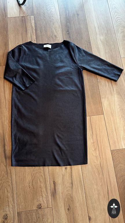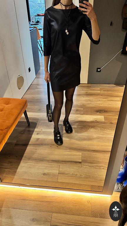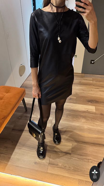 Black dress with sheer sleeves, with a second layer in other areas
