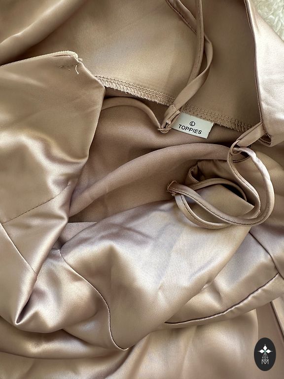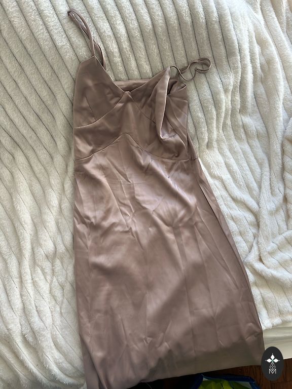 Garums 140 cm, pleci 37 cm, paduses 50 cm, viduklis 40 cm, ir gumija, drusku pastiepjas. Aizmugurē rāvējslēdzējs, ir šķēlums aizmugurē. Odere. Klāt nāk tāda paša auduma roze. Kleita ir ļoti kvalitatīva.