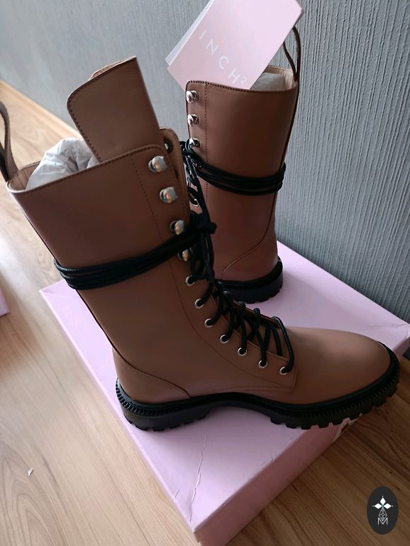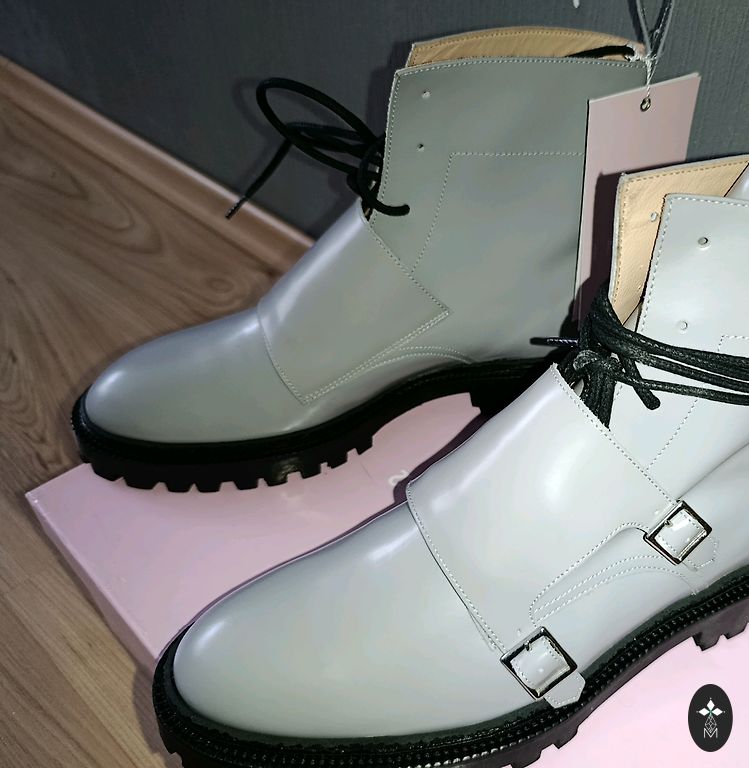 New boots. White leather and purple sole. Very sturdy, stitched. Price in store $310