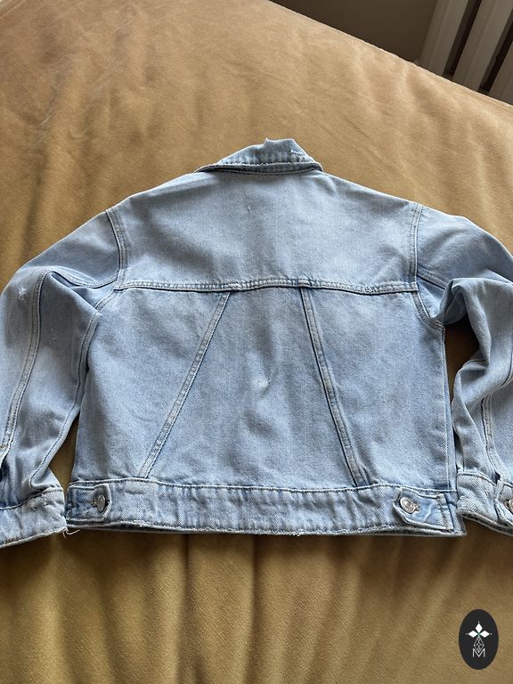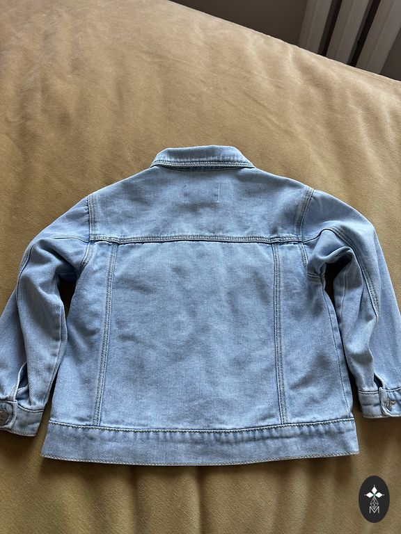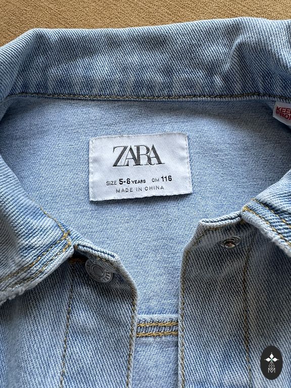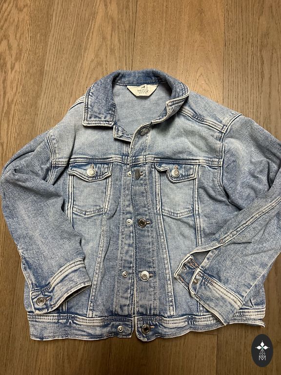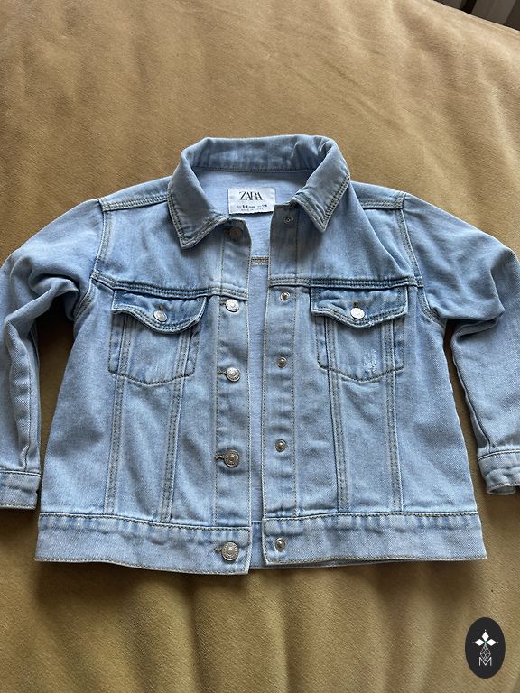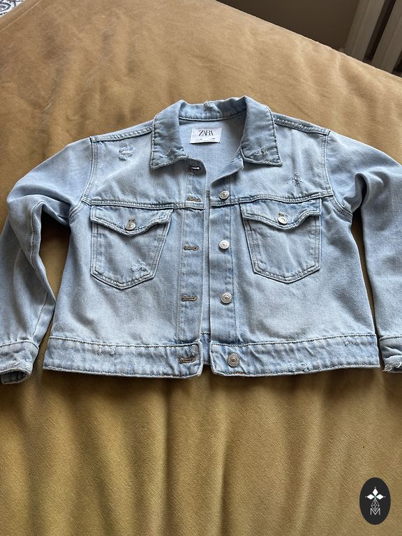 Džinsinis švarkas mergaitei iš Zara. Dydis 130, tinka 134-140 ūgiui. Švarkas nėra nei pailgintas, nei sutrumpintas. Labai malonu, kad tai yra suminkštintas džinsas, todėl vaikui taip pat malonu dėvėti. Švarke yra dėvėjimo efektai ant kraštų (matoma nuotraukose).