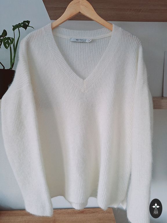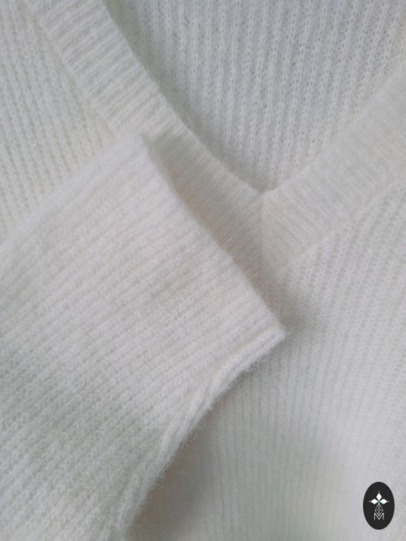 Milk-colored sweater with feminine puff sleeves. Can be worn with the neckline at the front or back. Wool content. Fluffy and soft, warm. Worn a few times. Fits M and L. Shipping included in the price.