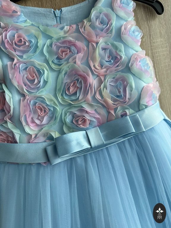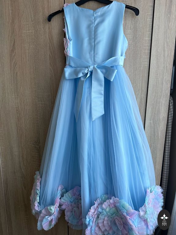 Grezna spilgti rozā kleita - augšdaļa ir izrotāta ar auduma rozītēm, sasienama ap kaklu, svārku daļa ir kupla, ar šlepi, josta ir izšūta ar pērlītēm. Derēs aptuveni LĪDZ 9 g.v. jeb augumiņā LĪDZ 132-136 cm
