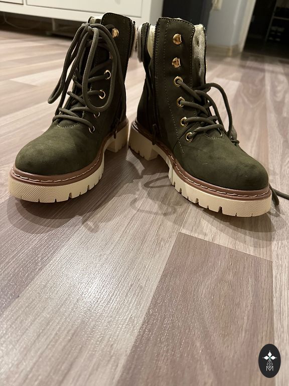 Внутри натуральная овчина, сверху натуральный бархат. Внутренний размер 26,2 см. Надевались один раз, оказались слишком широкими для меня. Подойдут для средней или широкой ноги. Указана фирма UGG (ML). Подошва из термостойкой резины. Пересылка не включена.