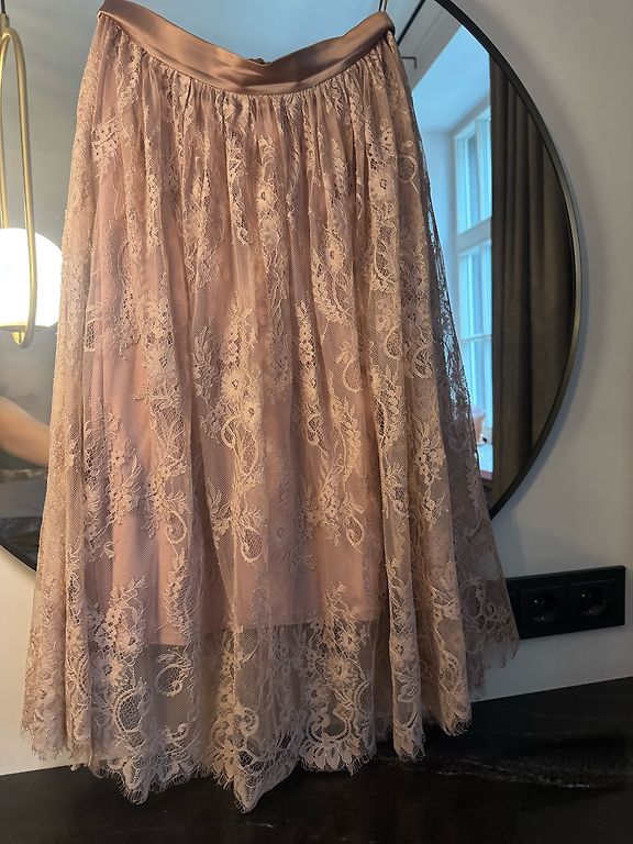 Skirt in two layers. Top layer of pinkish-purple lace, underskirt purple. Waist width 32cm. Length ~45cm. No size indicated for the skirt. Made in Latvia, Katrīna's fashion house.