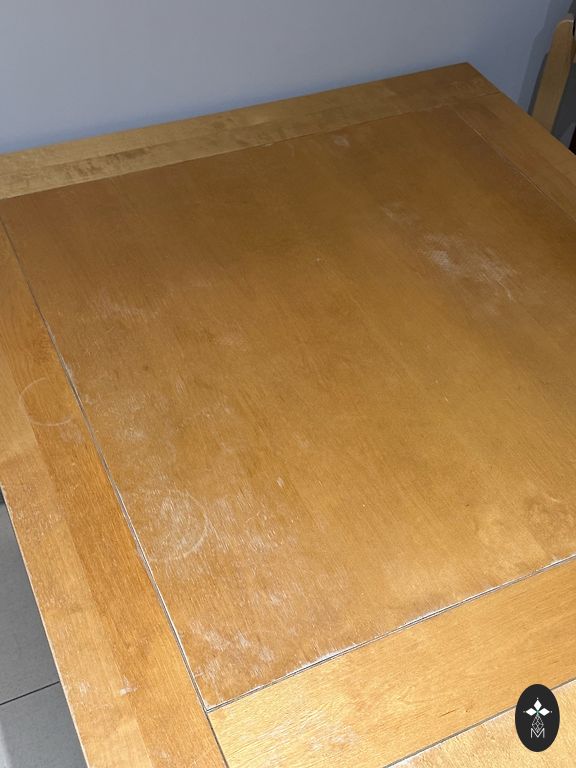 Galda defekti ir redzami fotogrāfijās — tos var novērst ar pulēšanu un lakošanu.