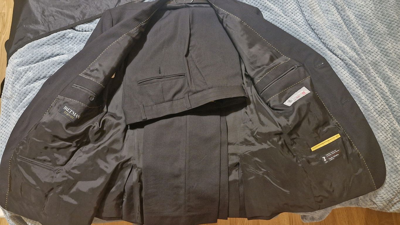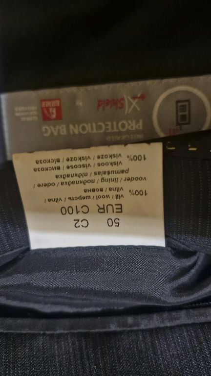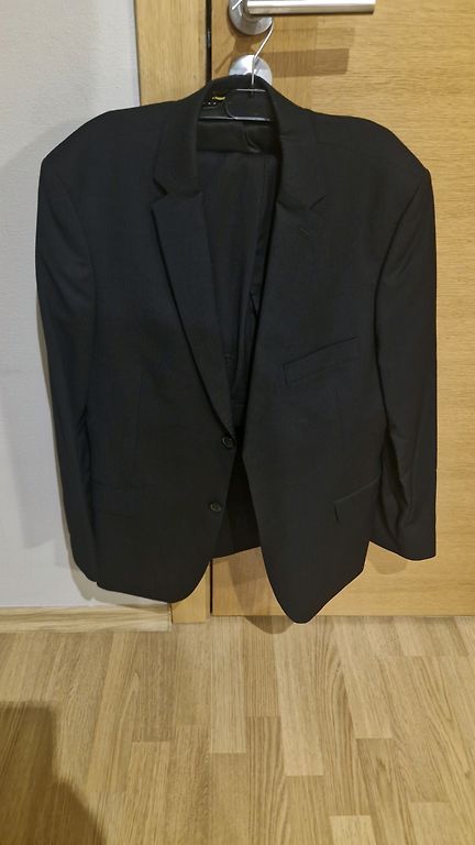Juodos kostiumo kelnės su nedideliu raštu.