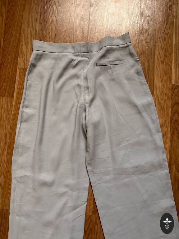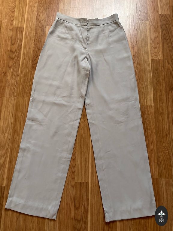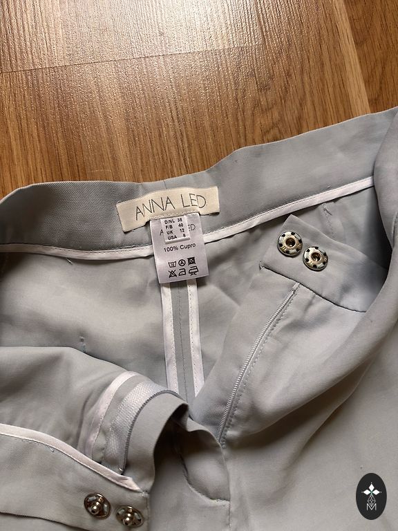 Žakete un bikses. Bikšu garums 101, viduklis 43 un nedaudz padodas, žaketei krūtis 52 un vēl nedaudz ir vietas. Ļoti skaists gaišs debeszils tonis. Žaketei ļoti pateicīgs piegriezums, slaidina.