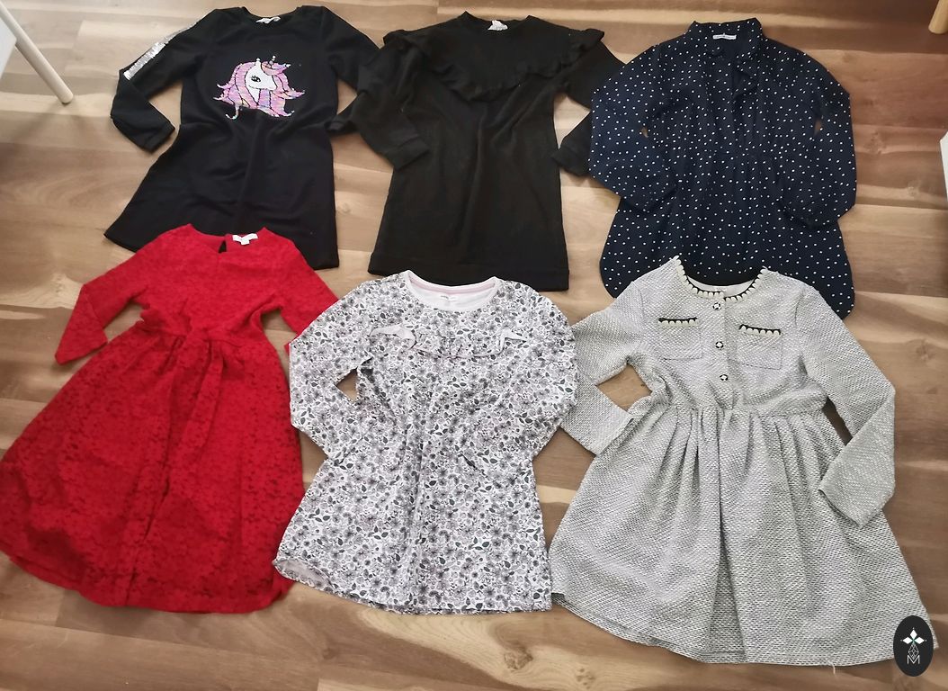 Komplekts ar 7 kleitām meitenei. Izmērs 116. Dažas vispār nav vilktas, bet visas labā stāvoklī, bez pleķiem, bez caurumiem