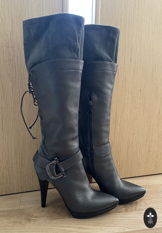 Zamšādas zābaki līdz celim, grafīta krāsā (39. izmērs)