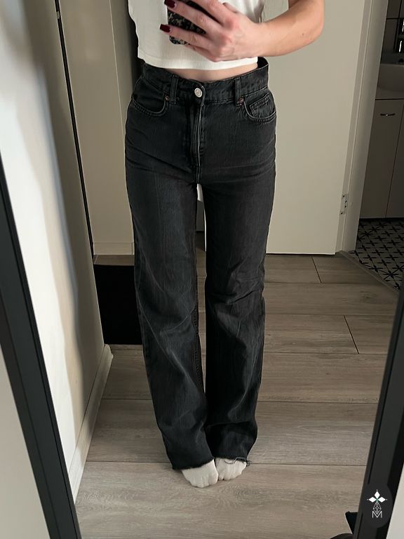 Džinsai su plačiomis klešnėmis, 34 dydžio. Ant galinės kišenės yra įbrėžimas.