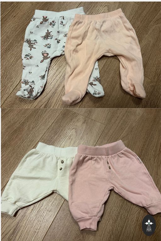 Size 56. Light pink pants and beige hat, both from Wooly Organic.