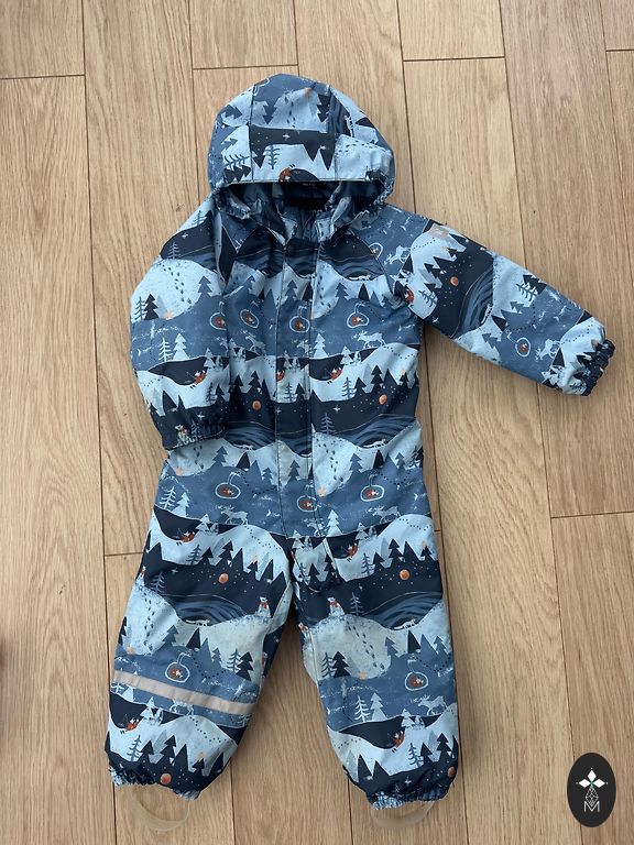 Filling: 70% duck down, 30% duck feathers. Removable hood, two pockets. Zipper and velcro - in perfect condition, leg elastics - undamaged. No holes in the jumpsuit, only sleeve and leg edges worn from washing, but visible only up close. Bought new, fit well for 2 seasons (ages 2-3.5).