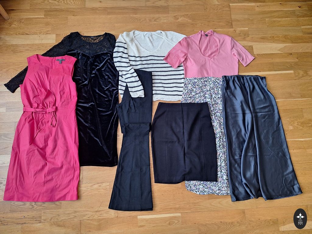 Šortai, marškinėliai, megztiniai, striukė, šalikas, krepšiai, pižamos šortai. + nauja kojinių pakuotė. Viskas naudota, bet geros būklės. Tiks S ir mažam M