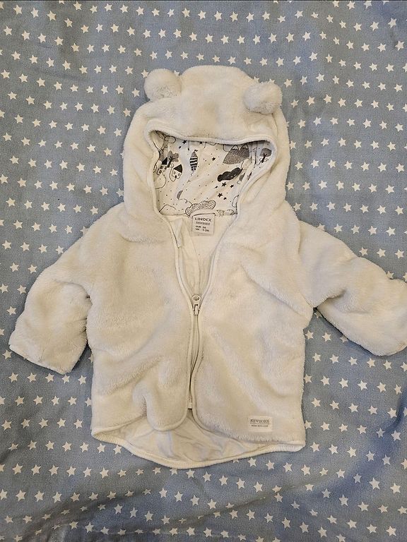 Megzta, šilta striukė kūdikiui. Apie 56 IZM. Ilgis 22 cm