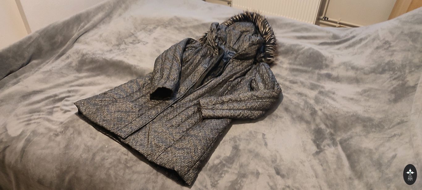 Stylish olive green jacket with fluffy trim and warm lining. Size S/M