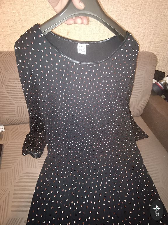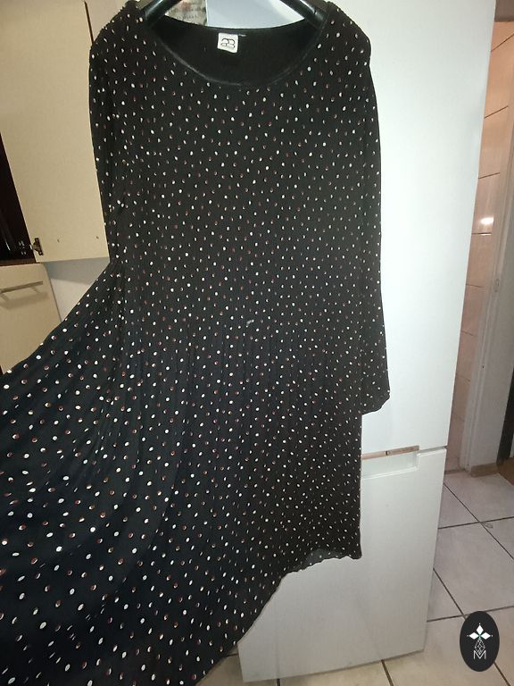 Tumši zaļa kleita ar ziediem. Kleita ar oderi, izņemot roku daļā. Iestrādāta gumijas jostiņa, elastīga vidukļa daļā, no tās uz leju audums gofrēts. V veida izgriezums ar pogājami priekšējo daļu.