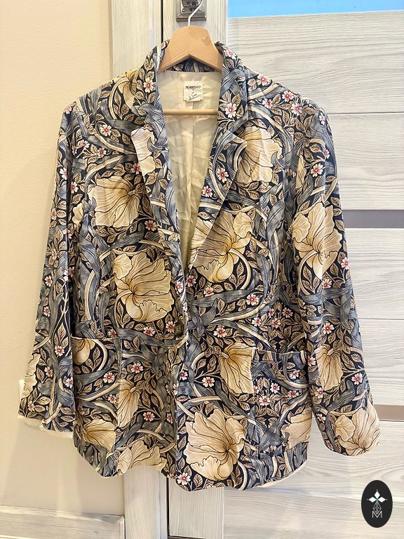 Tamsiai mėlynos audinio švarkas, su šviesiomis taškelėmis, laisvai krentantis, V formos iškirptė, 1 audinio saga, priekyje 2 kišenės, rankovės ilgis 3/4.