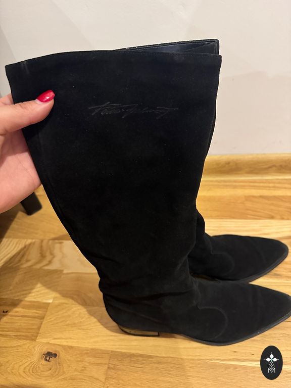 Ilgi moteriški batai, juodos zomšos imitacija. 40 dydis, patogūs su žemu kulnu, kojinės tipo, virš kelių. Viduje patogiam apsivilkimui užtrauktukas.