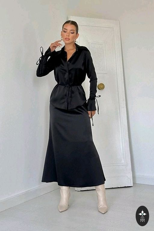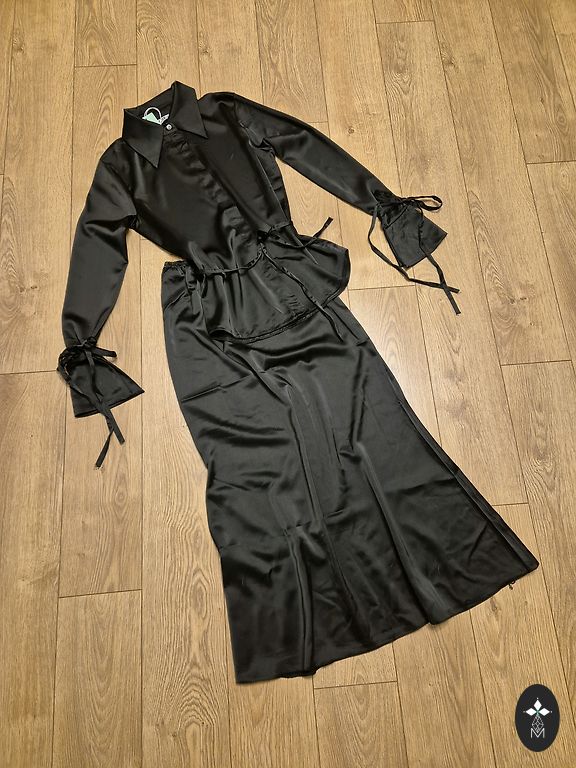 Švarkelis užsegamas vienu sagtele ties juosmeniu. Atrodo tikrai elegantiškai. Kelnės klasikinės, su išplatintais galais.