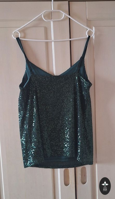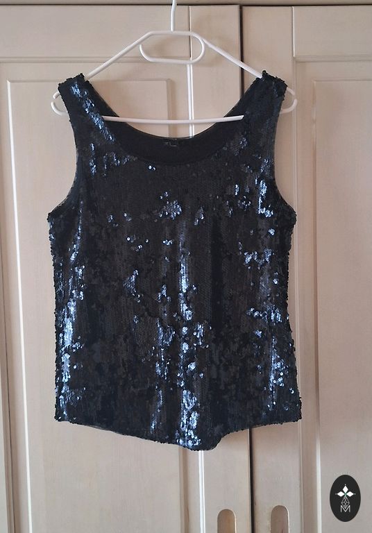 Suknelė su aktualiomis plunksnomis sijono dalyje. Audinys gana tvirtas, pasiduoda, tinka ir mažam L. Ilgis 121 cm, krūtinė 45, liemuo 39, klubai 48-50. Skeltukas gale 36, iškirptė 25 cm.