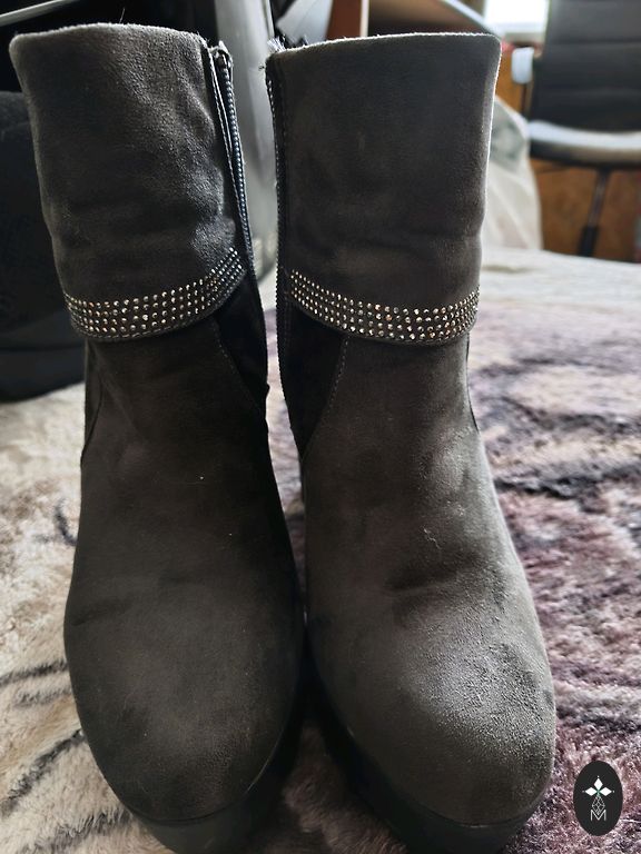Stiligi zabacini no natural as zamsadas. Augstums 15cm, Zola 4cm. Krasa ir tumsi sunu. Stvesti no Italijas. Loti ettas, Der platai kajai ar rausledzeju un sanu gumiju. Loti laba stavokli . Bez defektiem. Der 39izm.