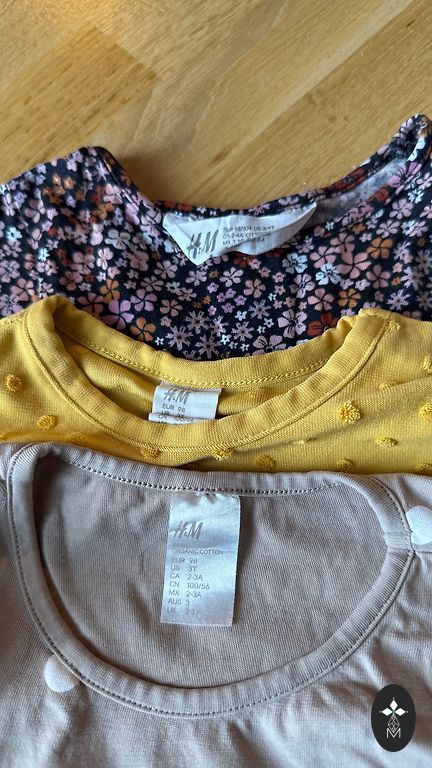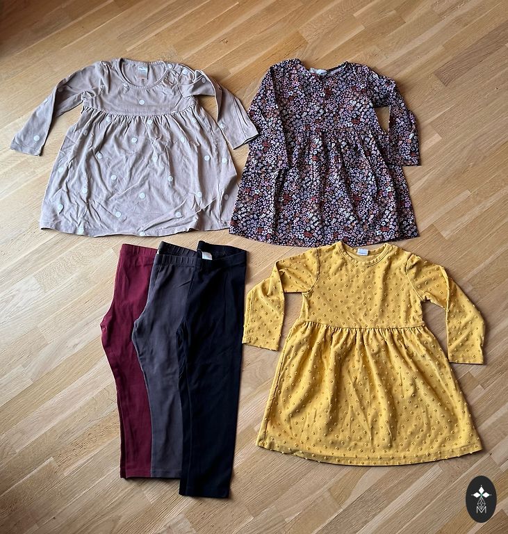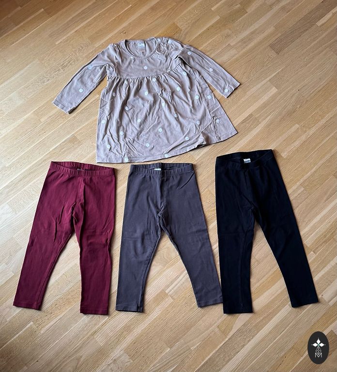 Ļoti labā stāvoklī. Tikai zaļajam Lindex bodijam mazi traipi. Pārējam apģērbam neko nemanīju.