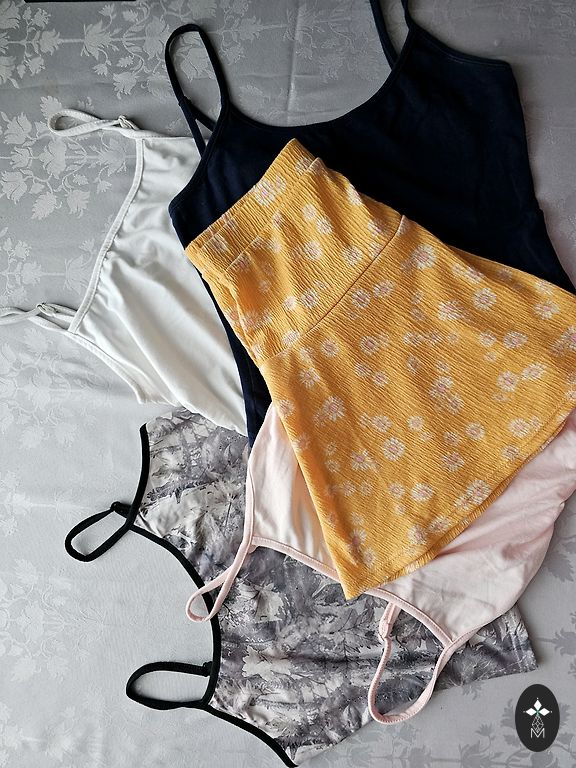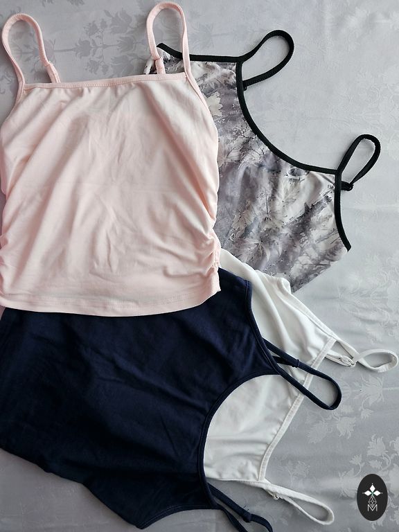 Trys Amisu bodžiai ir du viršutiniai drabužiai, tinkančių stabiliai XS.