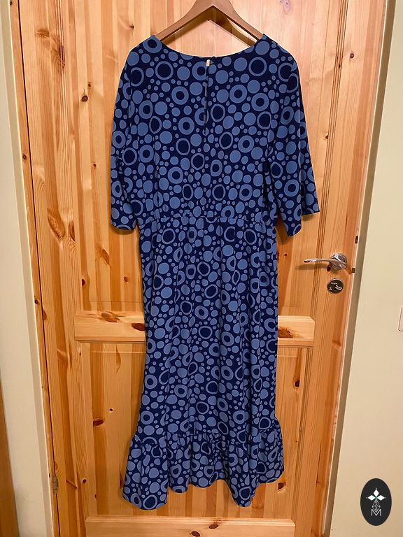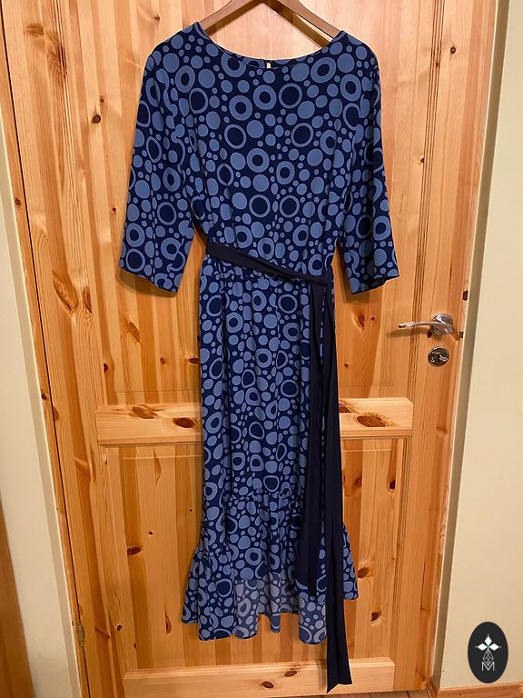 Krūtinės apimtis 62cmx2, išsitempia iki 73cmx2, šonuose užtrauktukas. Varpelio formos suknelė - nuo krūtinės plinta žemyn (klubuose visiems tiks). Suknelės ilgis 146cm. Trūkumas (3 paveikslėlis) - dėmelė prie kaklo, dėl suknelės margumo nėra labai pastebima.